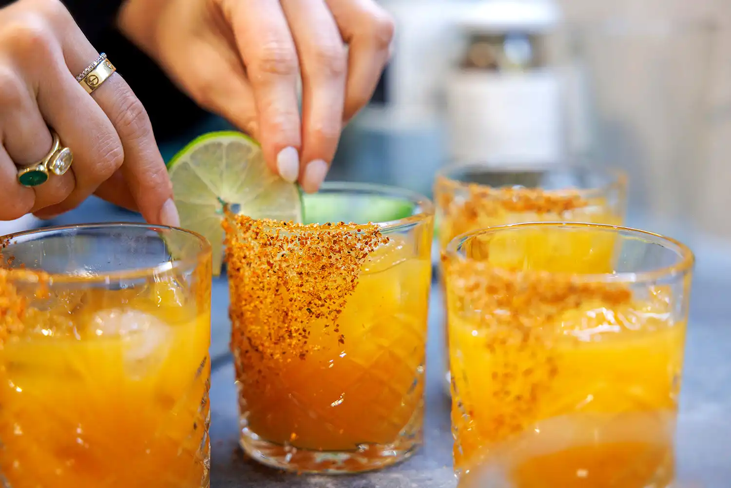 Rub the rim of each glass with a lime wedge. Dip the rim into a plate of Tajín seasoning or your mix of salt and chilli powder to coat.