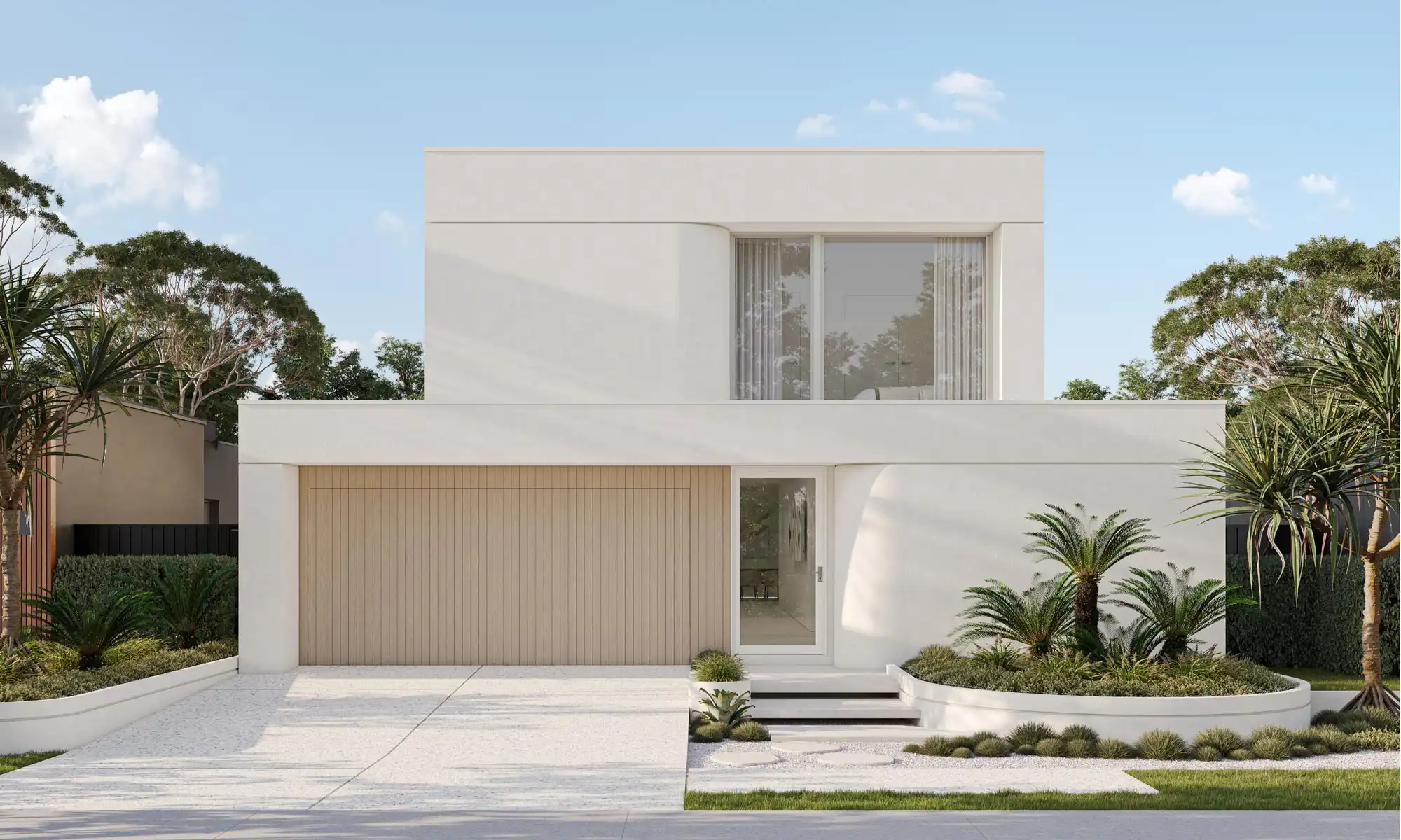 A modern design featuring open-plan living, a butler’s pantry, and a guest suite. Upstairs, the master suite, three bedrooms, and a rumpus room complete this contemporary home.