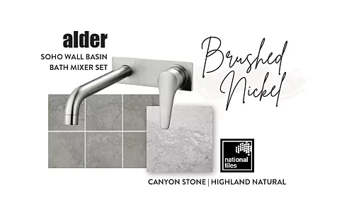 Try brushed nickel with the Canyon Stone Highland Natural from National Tiles. The warm, earthy tones of nickel paired with the weathered textures of the Canyon Stone will make any bathroom stand the test of time.