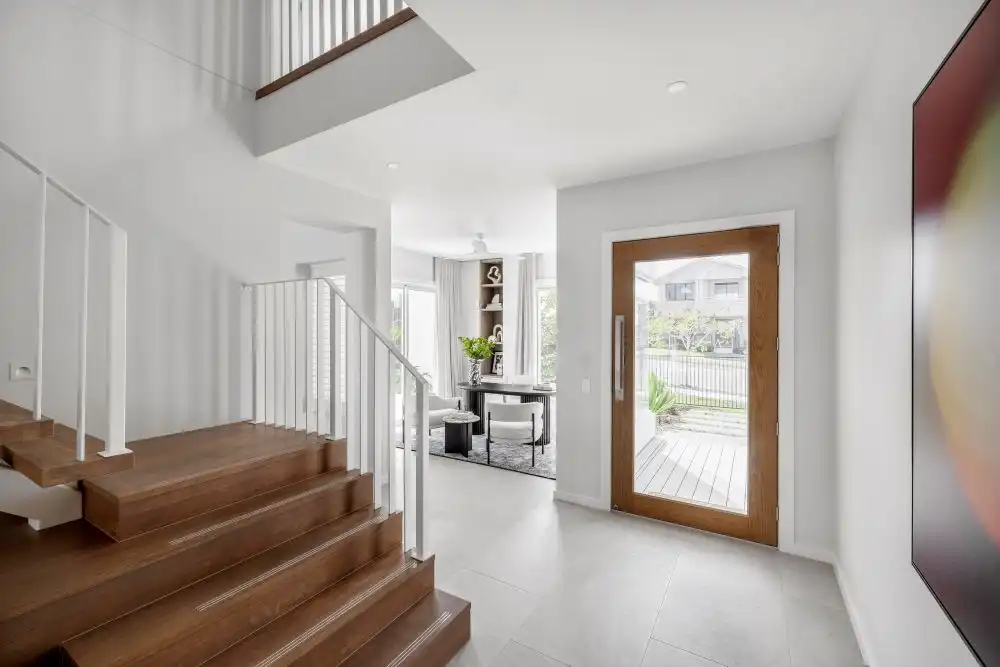 The architectural Oberon façade makes a memorable first impression before you even reach the door. The light-filled foyer offers a warm welcome, flowing seamlessly into a private home office, leading upstairs via the striking staircase, or draws you further down the hallway into the heart of the home.