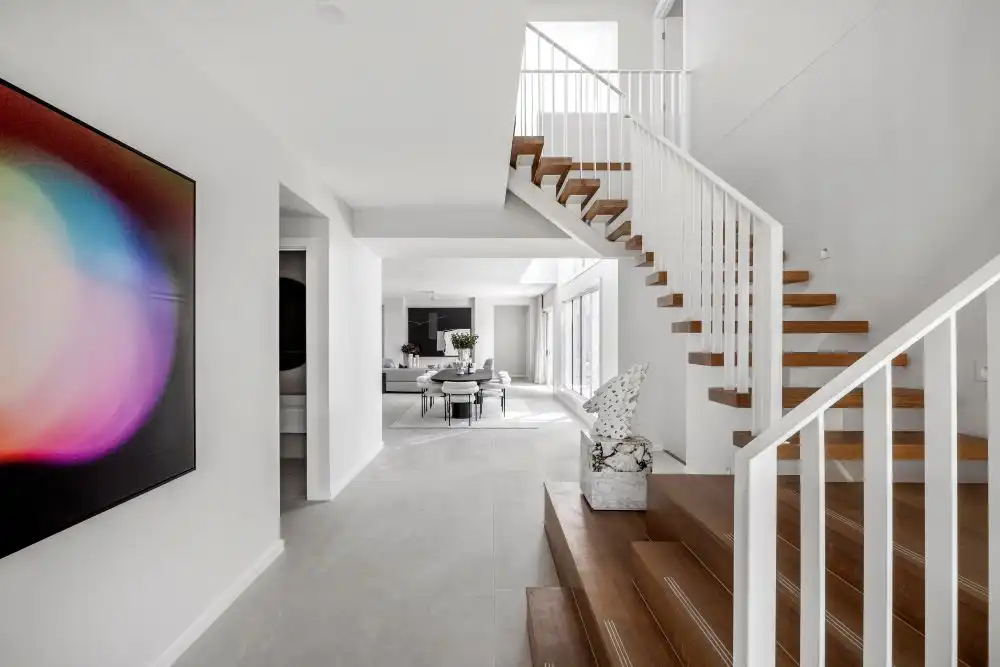 The interiors are effortlessly cool, embracing a neutral yet texture-driven palette; think cladded cabinetry, marble benchtops, and a semi-cantilevered timber staircase. This carefully curated backdrop lets bold, vibrant pieces take centre stage, giving artworks the attention they deserve.