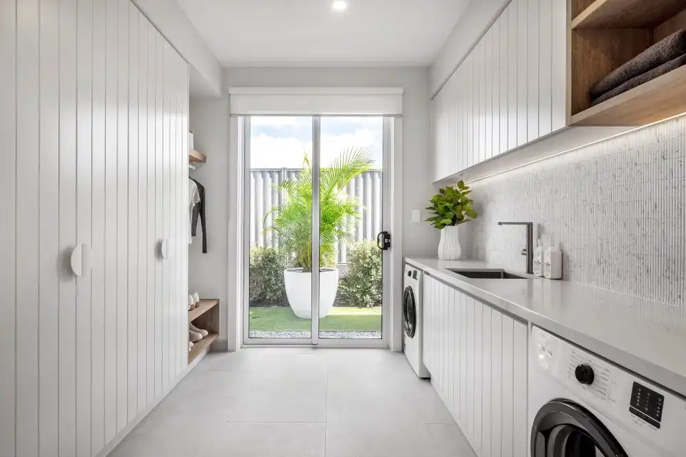 Contemporary interior selections including a marbled Statuario Maximus benchtop from Caesarstone and VJ cladding cabinetry, create a neutral yet tactile foundation.