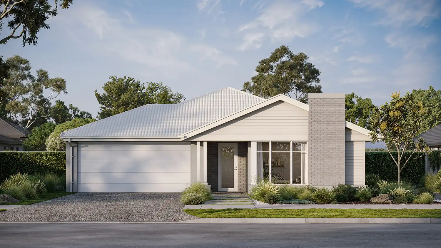 Making its debut is the brand-new Hampshire facade, a design that’s as versatile as it is timeless. With classic weatherboard cladding, a COLORBOND® steel roof and a striking stacked-stone feature pillar, it blends coastal Hamptons elegance with the rustic charm of a modern farmhouse. Looking for a bolder, more dramatic look to your exterior? This facade transitions effortlessly to suit a darker, more industrial palette too.