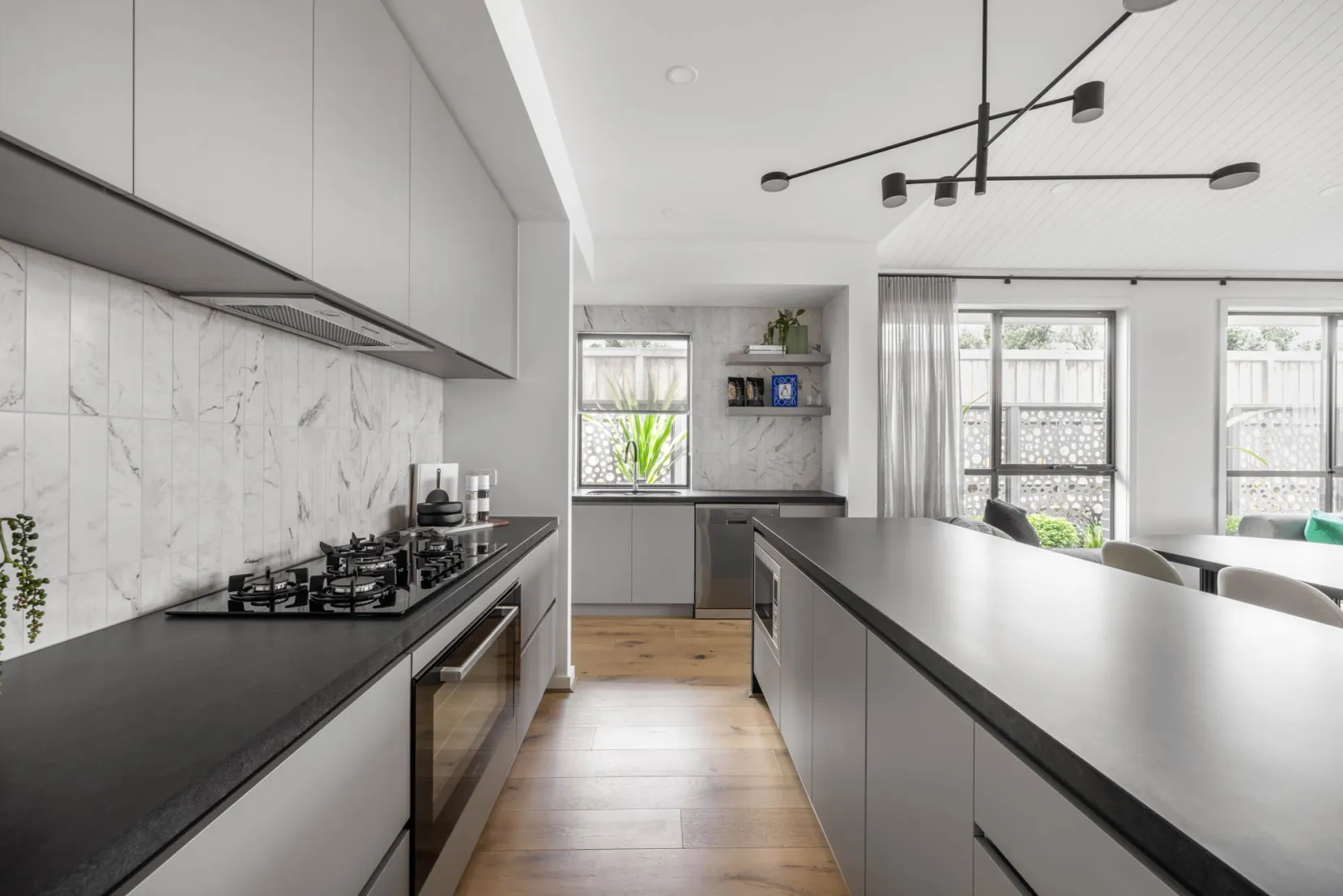 - Overhead cupboards and bulkhead to canopy rangehood wall.
