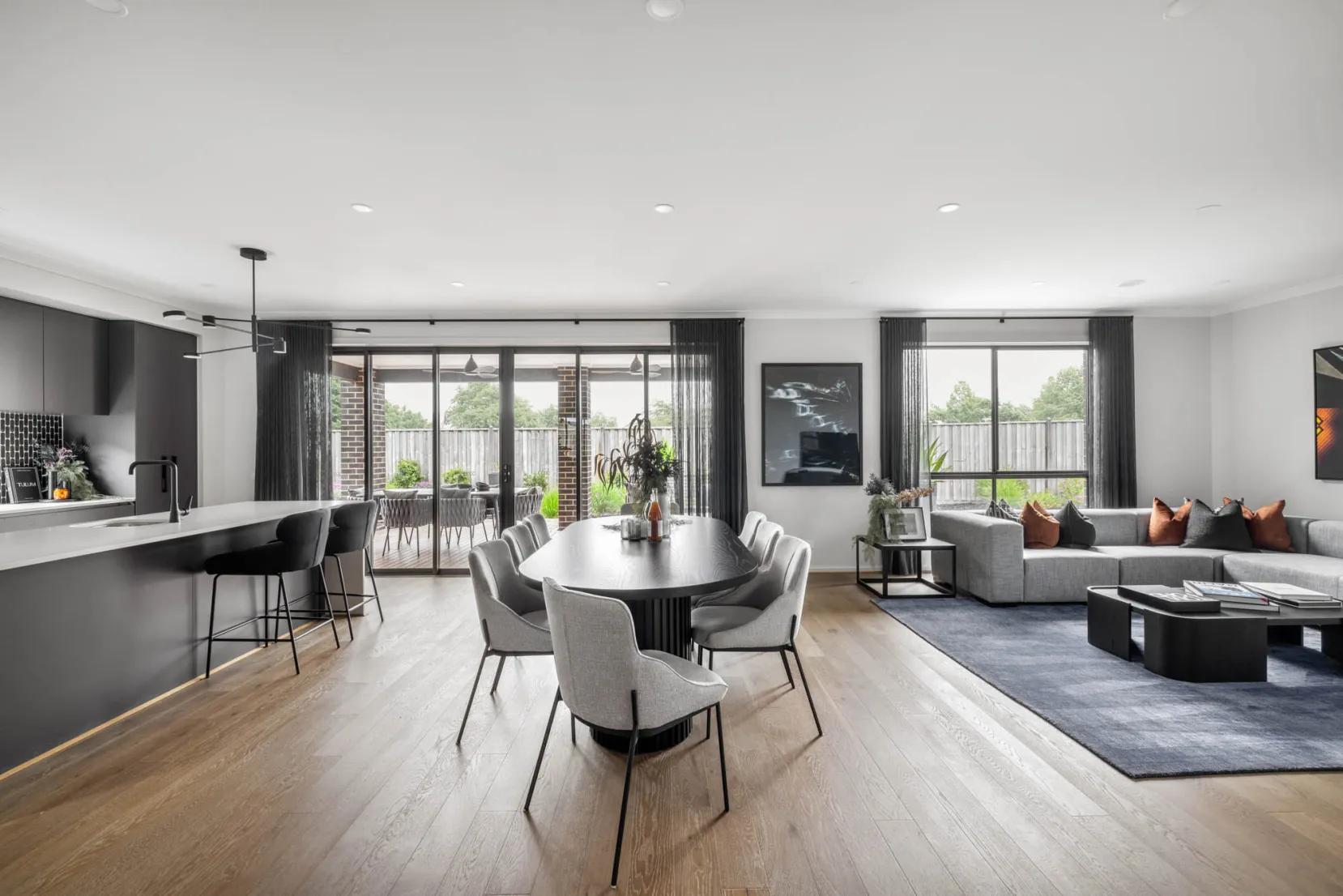 The Lomandra 43, a 5-bedroom, 3-bathroom double-storey home with 3 living spaces, combines impressive proportions with easy elegance, ideal for families desiring shared and private spaces. Designed for 16m+ blocks, the floor plan opens with a stylish living room and features a light-filled, expansive living zone with a sleek, contemporary kitchen and walk-in pantry. The ground floor includes a guest suite, while the upstairs boasts a resort-style master suite, three children's bedrooms, and a sizable rumpus room, perfect for kids' activities or family TV nights.